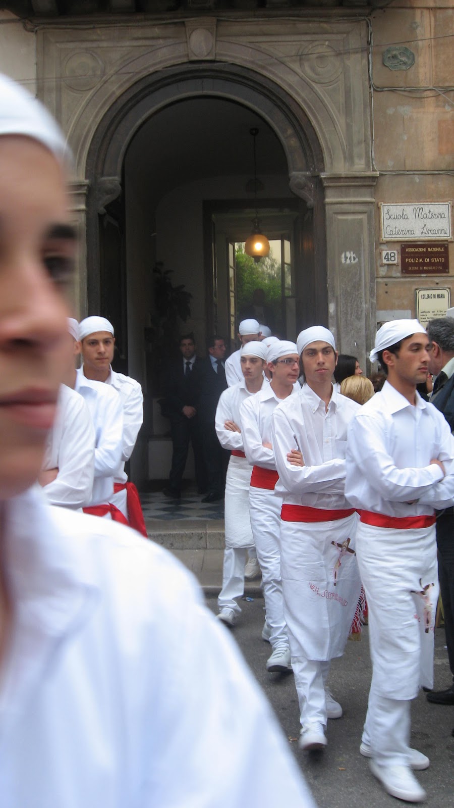 I FRATELLI ESCONO DAL "COLLEGIO DI MARIA" CON GLI STENDARDI ED IL GONFALONE:
